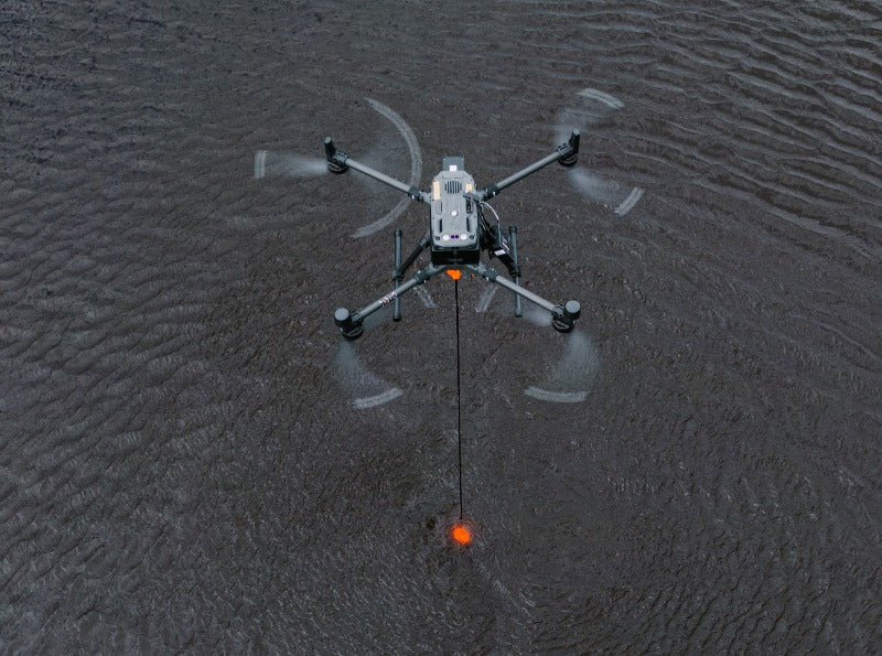 Integrada en un dron, la ecosonda utiliza ondas sonoras para medir la profundidad del agua. Una ecosonda envía ondas sonoras y mide el tiempo que tarda en volver el eco del sonido. Se conoce la velocidad del sonido en el agua para poder calcular la profundidad. Las ecosondas son herramientas cruciales para el monitoreo medioambiental y la cartografía del terreno subacuático. La ecosonda montada en drones es perfecta para recopilar datos en zonas de difícil acceso o aguas poco profundas.