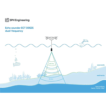 Integrada en un dron, la ecosonda utiliza ondas sonoras para medir la profundidad del agua. Una ecosonda envía ondas sonoras y mide el tiempo que tarda en volver el eco del sonido. Se conoce la velocidad del sonido en el agua para poder calcular la profundidad. Las ecosondas son herramientas cruciales para el monitoreo medioambiental y la cartografía del terreno subacuático. La ecosonda montada en drones es perfecta para recopilar datos en zonas de difícil acceso o aguas poco profundas.